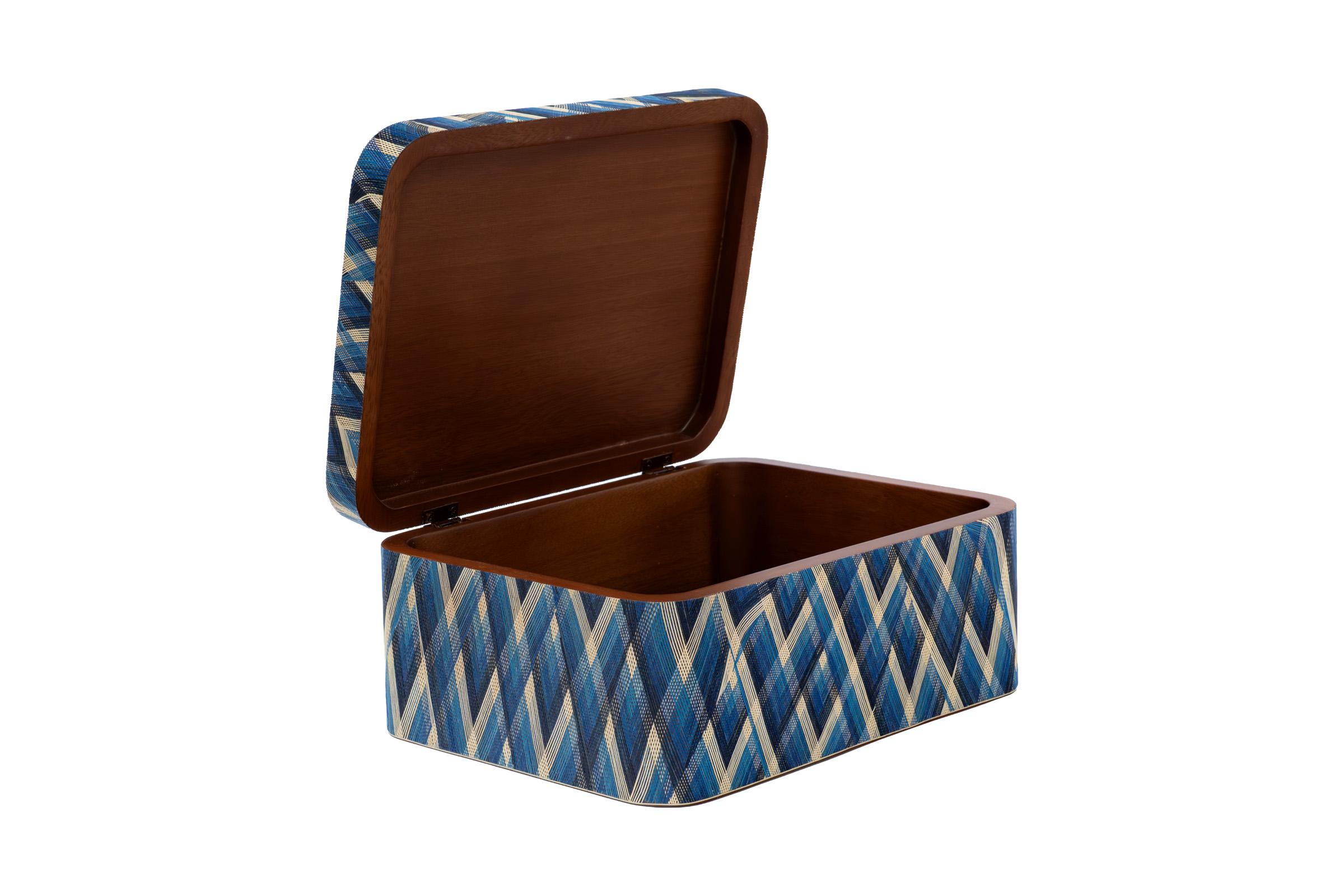 Large chest decorated with a floral design in shades of blue, using the traditional technique of wheat straw veneering. The technique of wheat straw veneering is typical of the ancestral peoples of San Juan de Pasto, capital of the department of Nariño in Colombia, and is one of the oldest and most distinctive craft techniques in the area. This technique consists of creating strands and/or molds from wheat fiber that has been flattened and dyed with natural dyes, which are then attached to wooden bases, such as bowls, vases, chests, or any other product made of wood, creating designs rich in color, culture, and tradition.