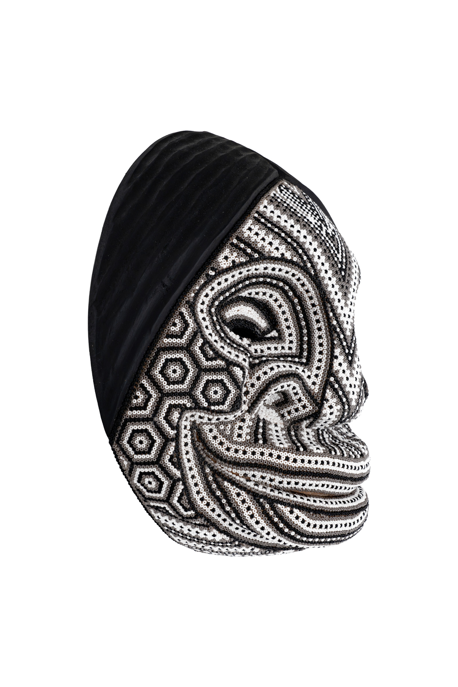 Bëtsknaté mask, or Carnival of Forgiveness, handmade by expert artisans from the Sibundoy Valley in Putumayo. Hand-carved from willow wood and decorated with Czech beads, these masks reflect the traditions of the Inga and Kamentsá communities. They typically express emotions such as happiness, sadness, doubt, and amazement, among others. The combination of colors and bead designs often tell personal or collective stories.