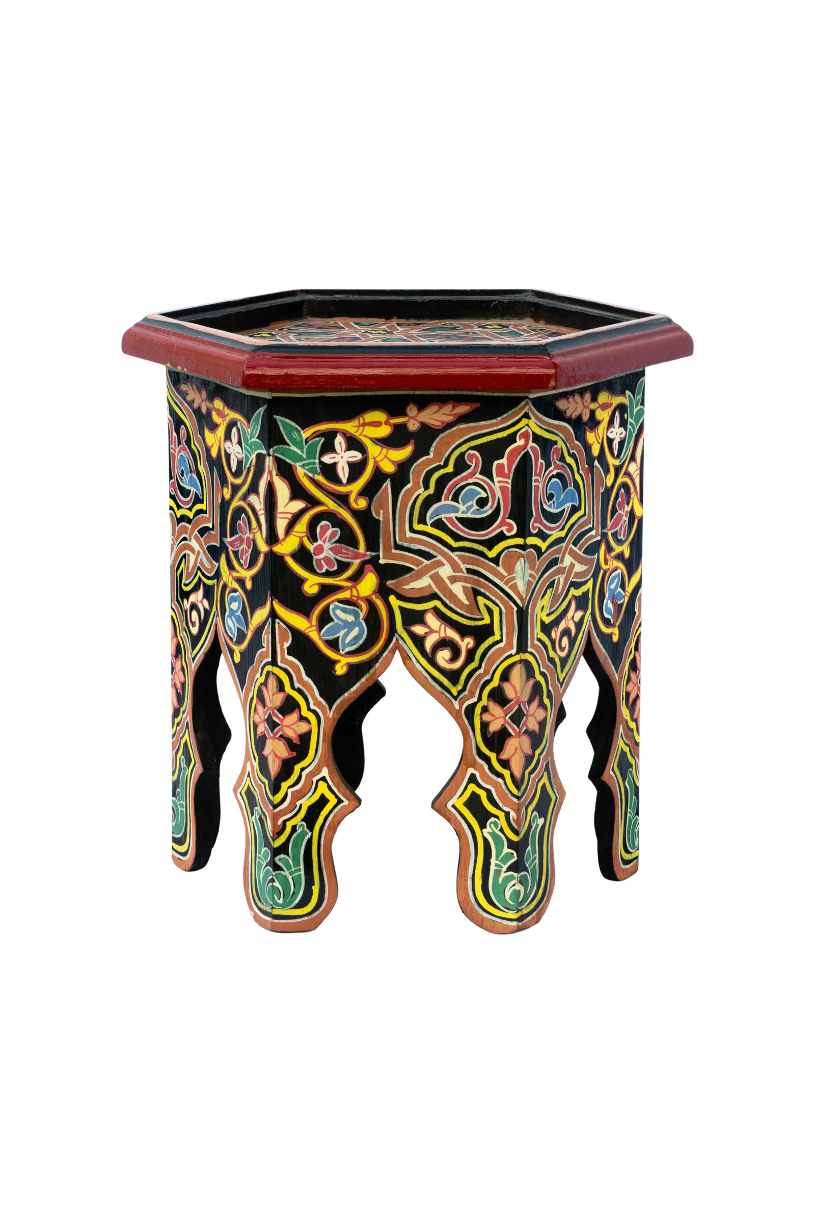 Moroccan side table handcrafted in wood in a hexagonal shape, hand-painted with a black base, decorated with floral and geometric designs in different colors. Each piece is made entirely by hand, so no two are alike. They may have imperfections that do not affect their use or aesthetics and are characteristic of handcrafted design.