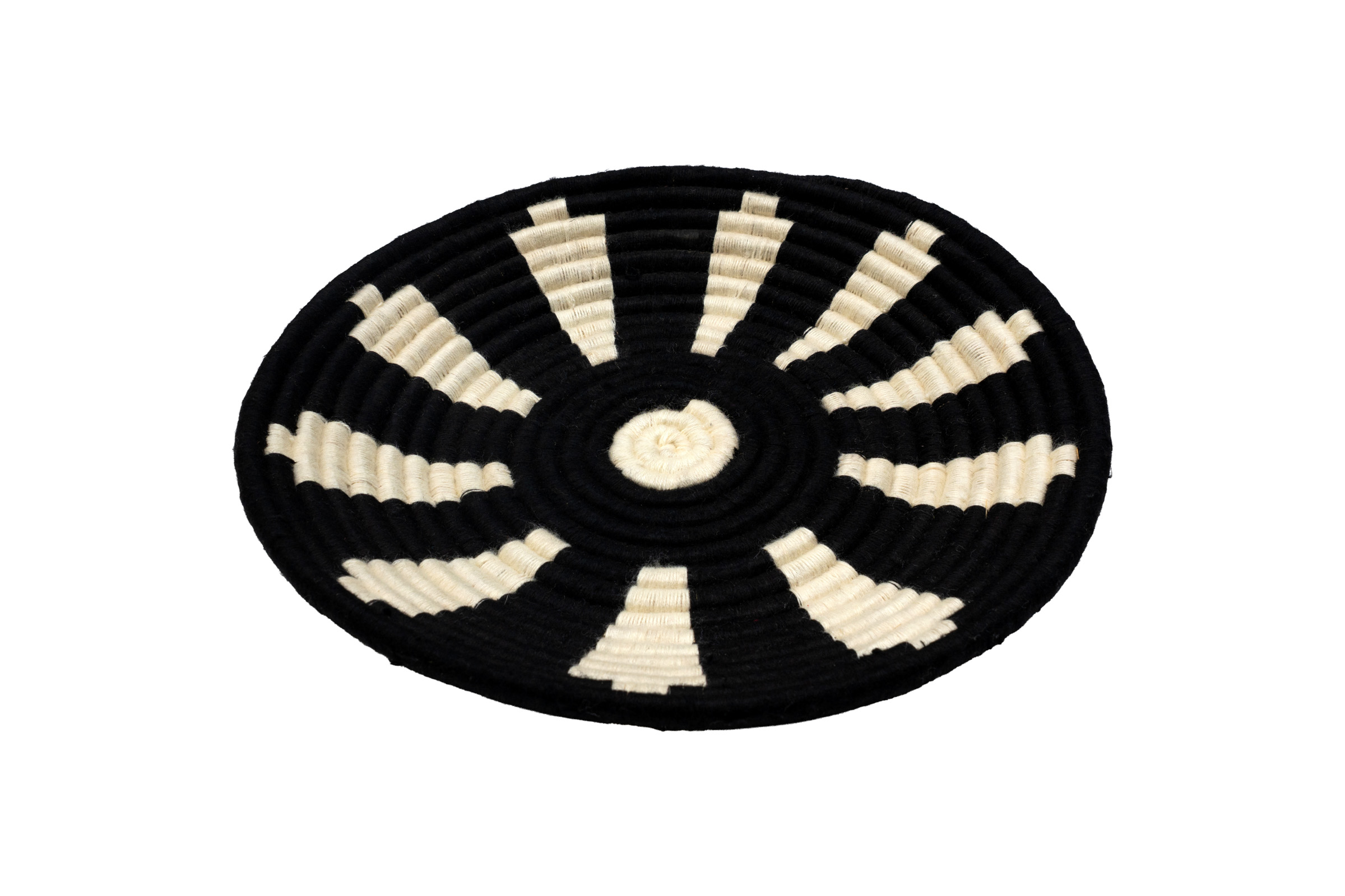 Decorative plate handwoven by expert Moroccan artisans, its base made from natural fibers provides support for the weaving of designs created in pre-dyed natural wool. Ideal for use as a wall decoration in boho or ethnic style spaces.
